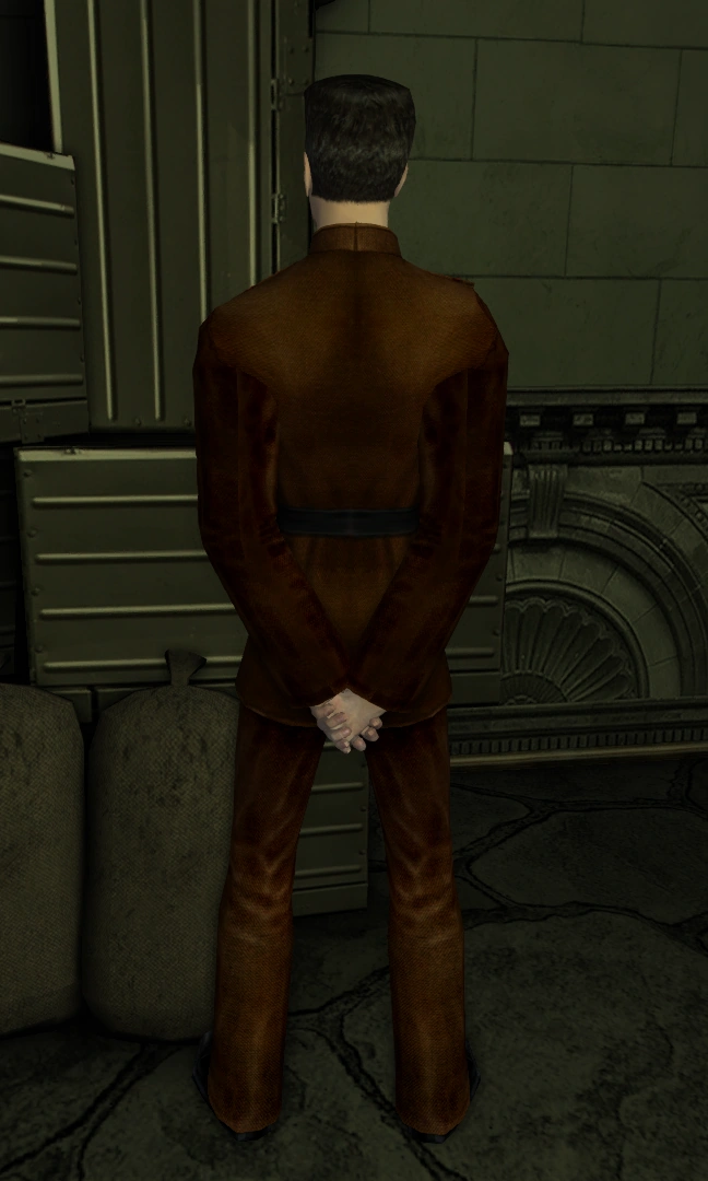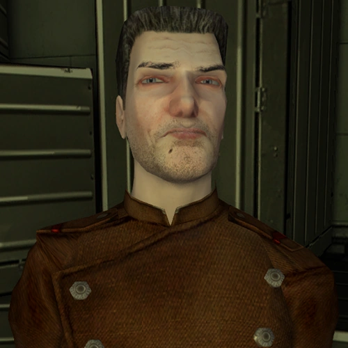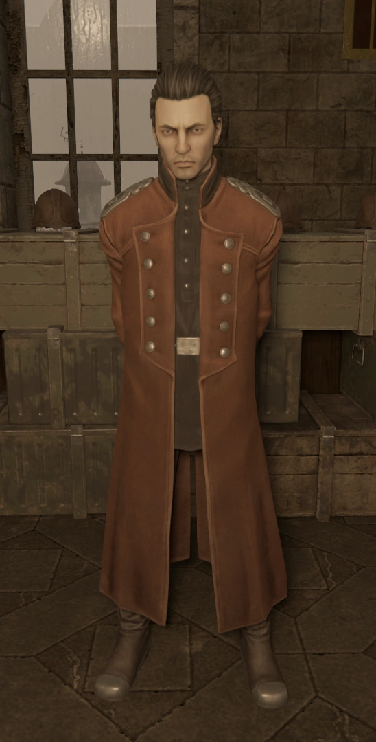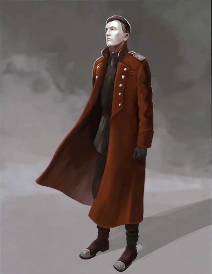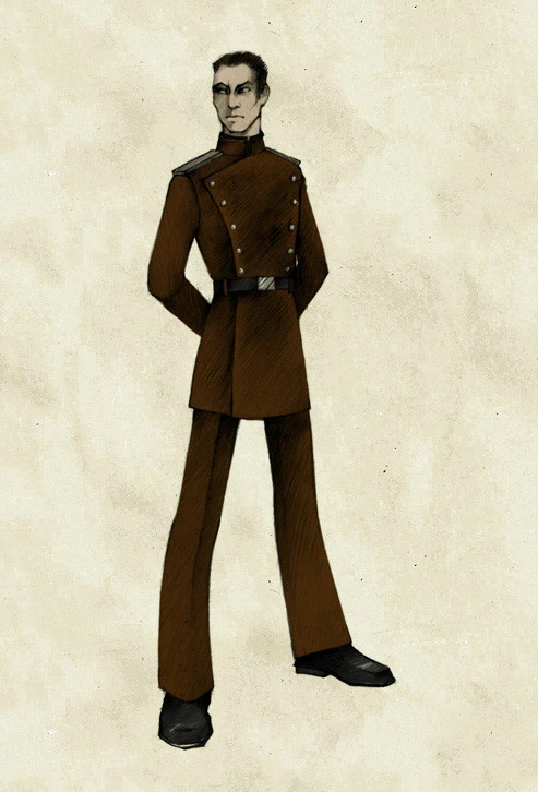 Высокий стройный военачальник в красивом алом мундире с погонами, на которых видно число "17". Небрит, но аккуратно причёсан. Под мундиром носит короткую чёрную униформу и армейские сапоги. Несмотря на звание и биографию не носит ни медалей, ни орденов. В отличии от собственных офицеров, носит обычный ремень, без украшений на бляхе.
