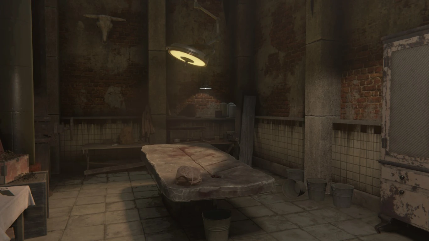 В Убежище Гаруспика расположен алембик, в котором герой может создавать твириновые настойки, смеситель, предназначенный для создания мёртвых каш, большой сундук для хранения вещей, а также самодельная кровать. На импровизированном столе лежит стопка заметок Исидора, которые уже невозможно разобрать, на полках лежат кости и стоят бидоны со странной красной субстанцией, а также прочие предметы быта, необходимые для длительного пребывания в лаборатории. На стенах висят редкие плакаты со схемами человеческого тела, по углам расставлены мелкие ящики, у кровати стоит лопата. На улице, недалеко от входа лежит мусорный контейнер. Из лаборатории Стахом Рубиным был украден микроскоп.