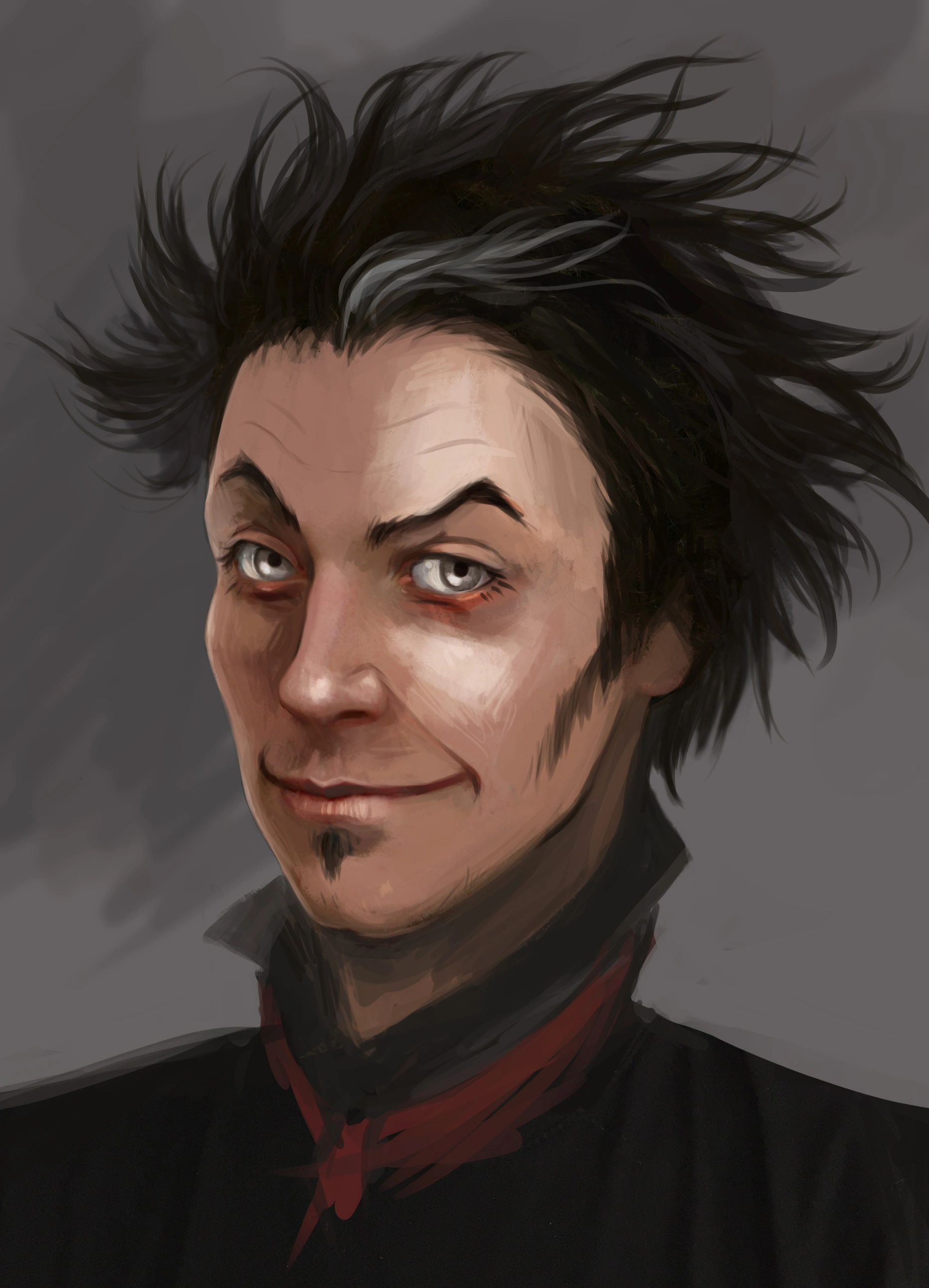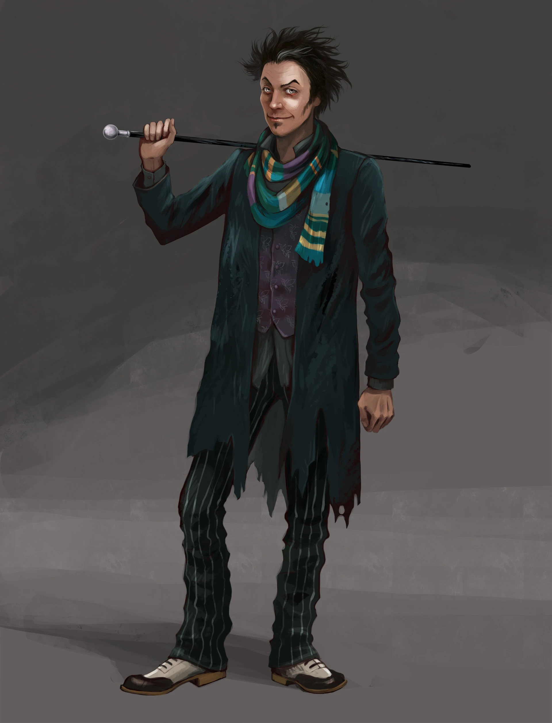 | “ | Внешность: атлетически сложенный карлик, бывший циркач. Очень гордая осанка – следствие травмы позвоночника, после которой он ушел из цирка. Грудь пересекает длинный шрам с захлестом на левую лопатку. Красивый выразительный нос с горбинкой, кончик крючком загибается вниз. На лице обычно надменная улыбка. Пижон. Держится изящно, одевается со вкусом. Ходит всегда с тяжелой тростью. Поза: гордо вышагивает. |