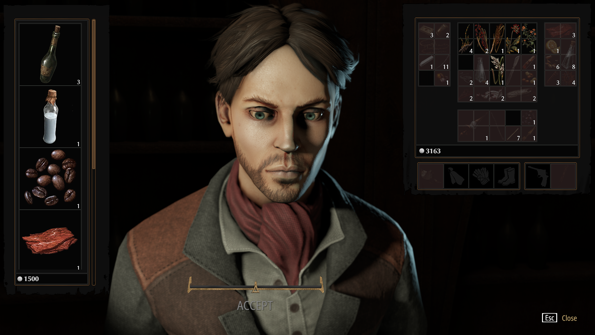 In Pathologic 2, all trade is done with the barkeep, who sells food and beverages, and also buys herbs from the Haruspex. Each day, a specific herb will be requested, for which the barkeep will pay extra. The barkeep is available to trade with regardless of the player's reputation. Unlike all other stores in the game, the Broken Heart's purse does not change over time, and remains ¤1500 each day.