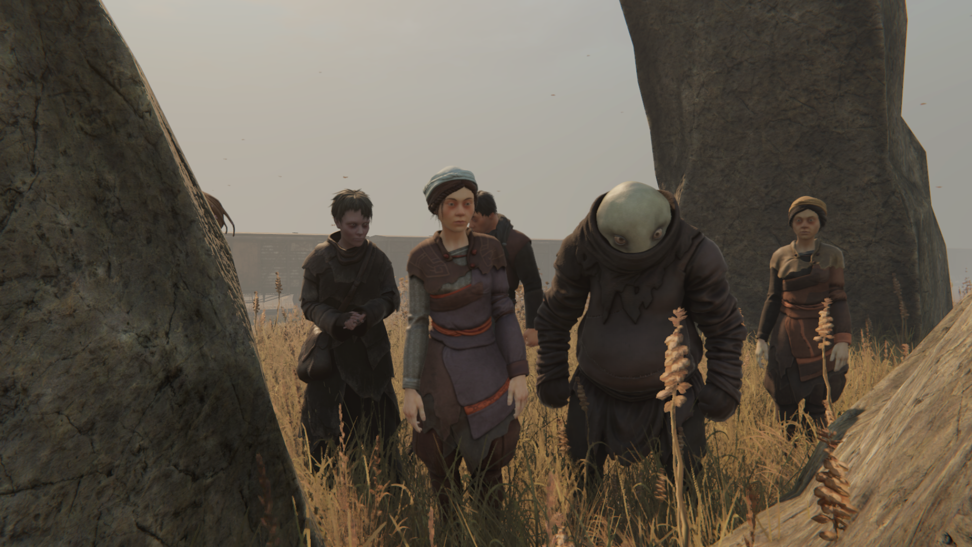 Если герой повернётся назад и поднимет взгляд, то на одном из камней увидит лавочку, на которой сидят Крошка и Малыш, по имени Ячмень и Грибок. Поговорив с ними, игрок разблокирует достижение Мы просто смотрим.