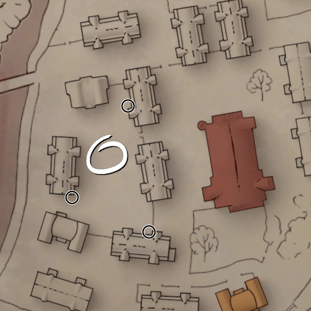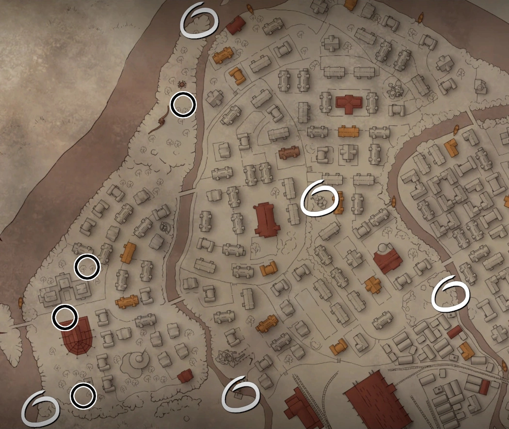The locations of Act 2's quest-relevant caches and the groups of children associated with them (circled in black & white).