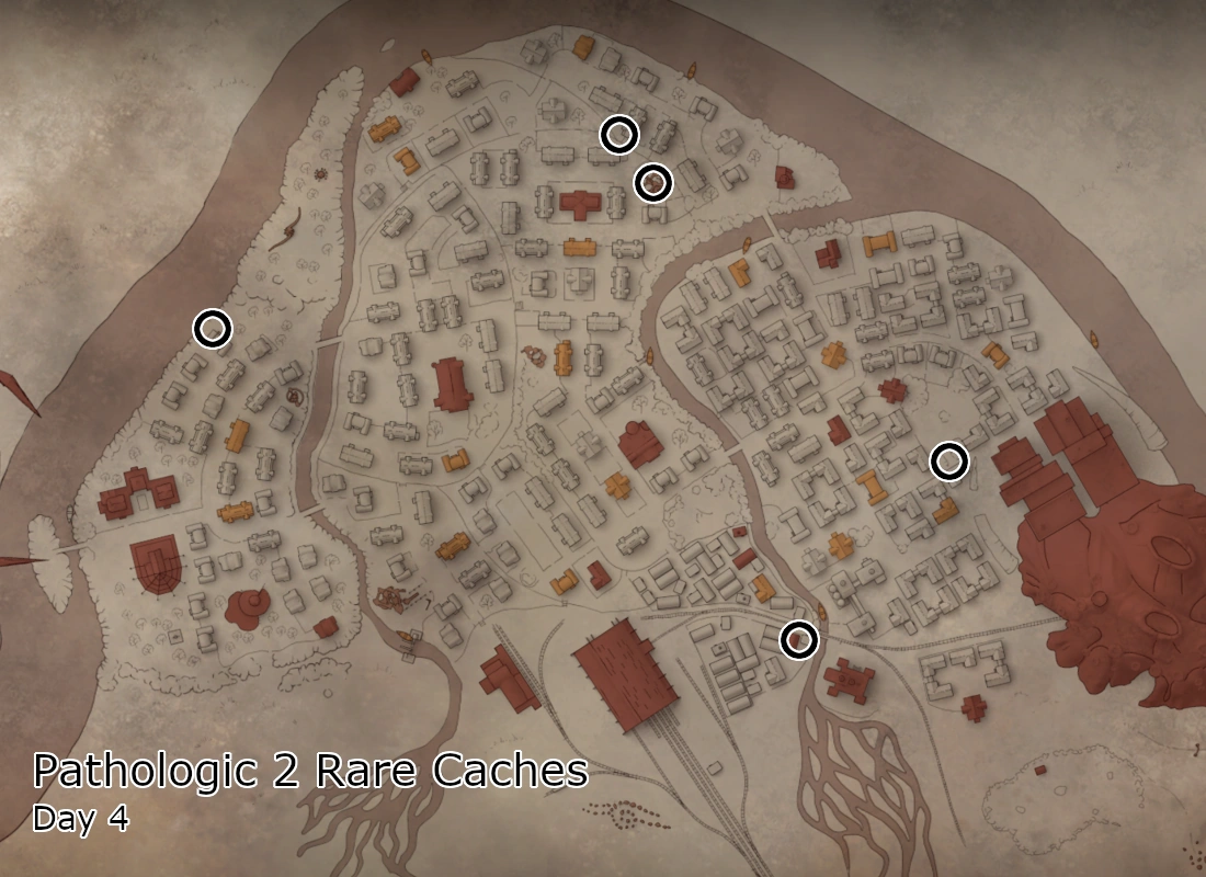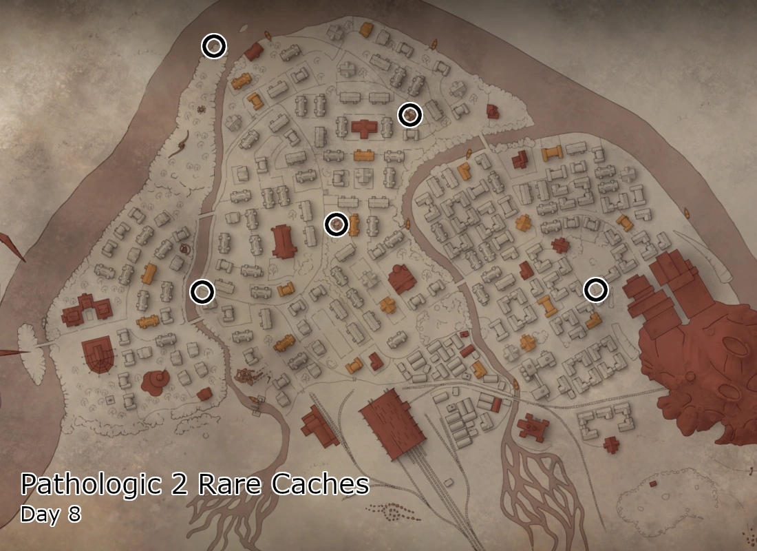 There are 23 caches spread across the town. Caches reset at 07:30 each day, except for 5 particular caches on Day 3 due to a scripted quest that remains available for all of Act 2 (which ends at 07:30 on Day 4). Consuming Twyrine can reveal some caches' location on the map, however doing so will not change their contents. In terms of their spawned items, each day caches are assigned to one of two categories: