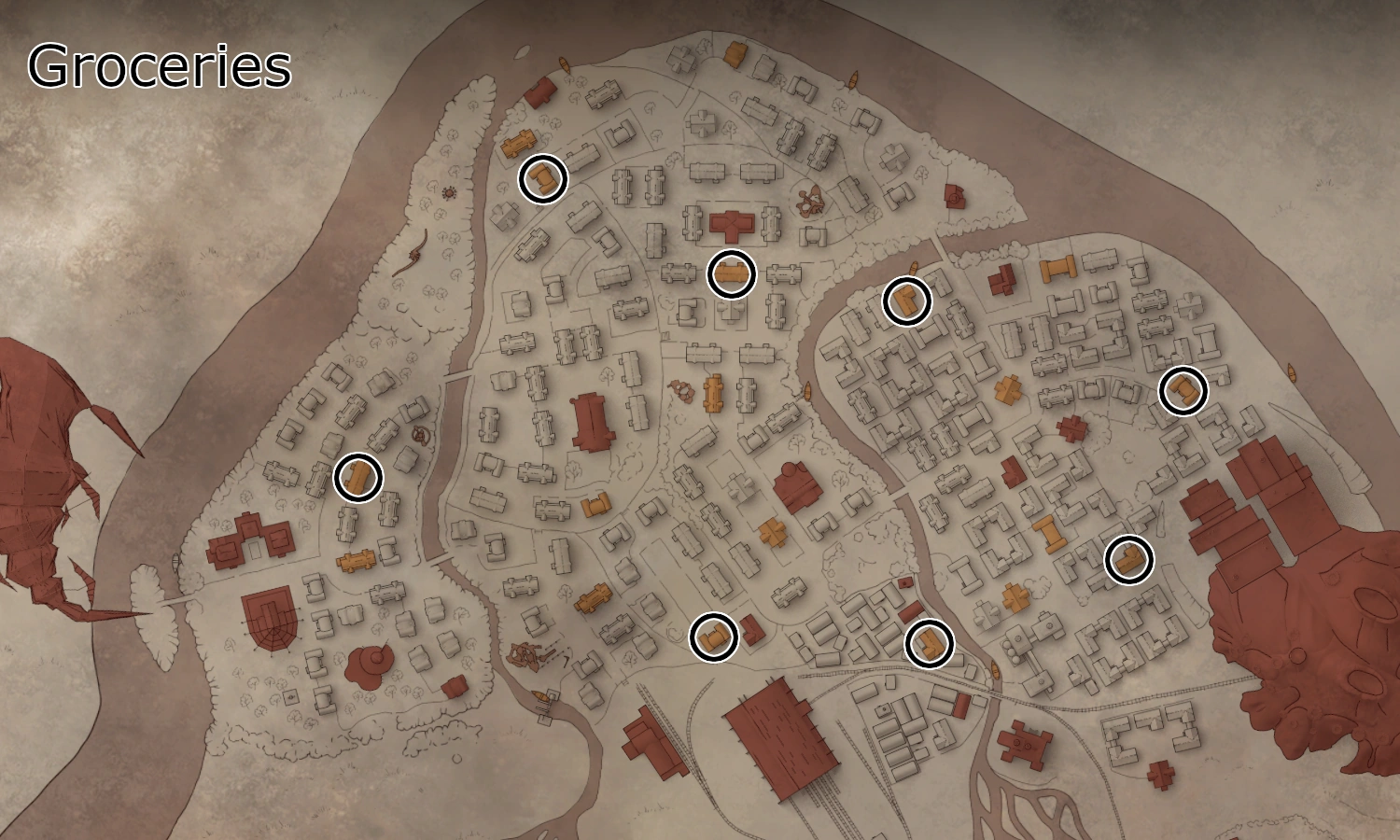 A map of all the Groceries in Pathologic 2