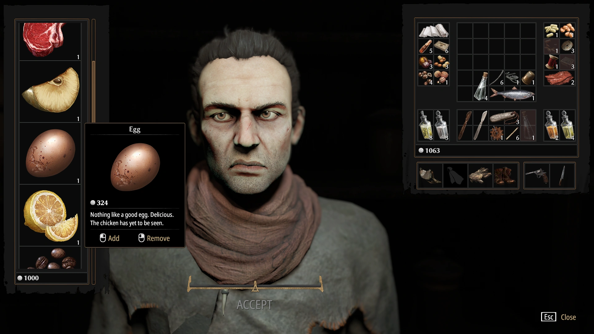- On Day 7, after the Inquisitor arrives, map hover text for the Shady Shop changes from "In this shop, even outcasts can buy food." to "In this shop, food is still sold for money."