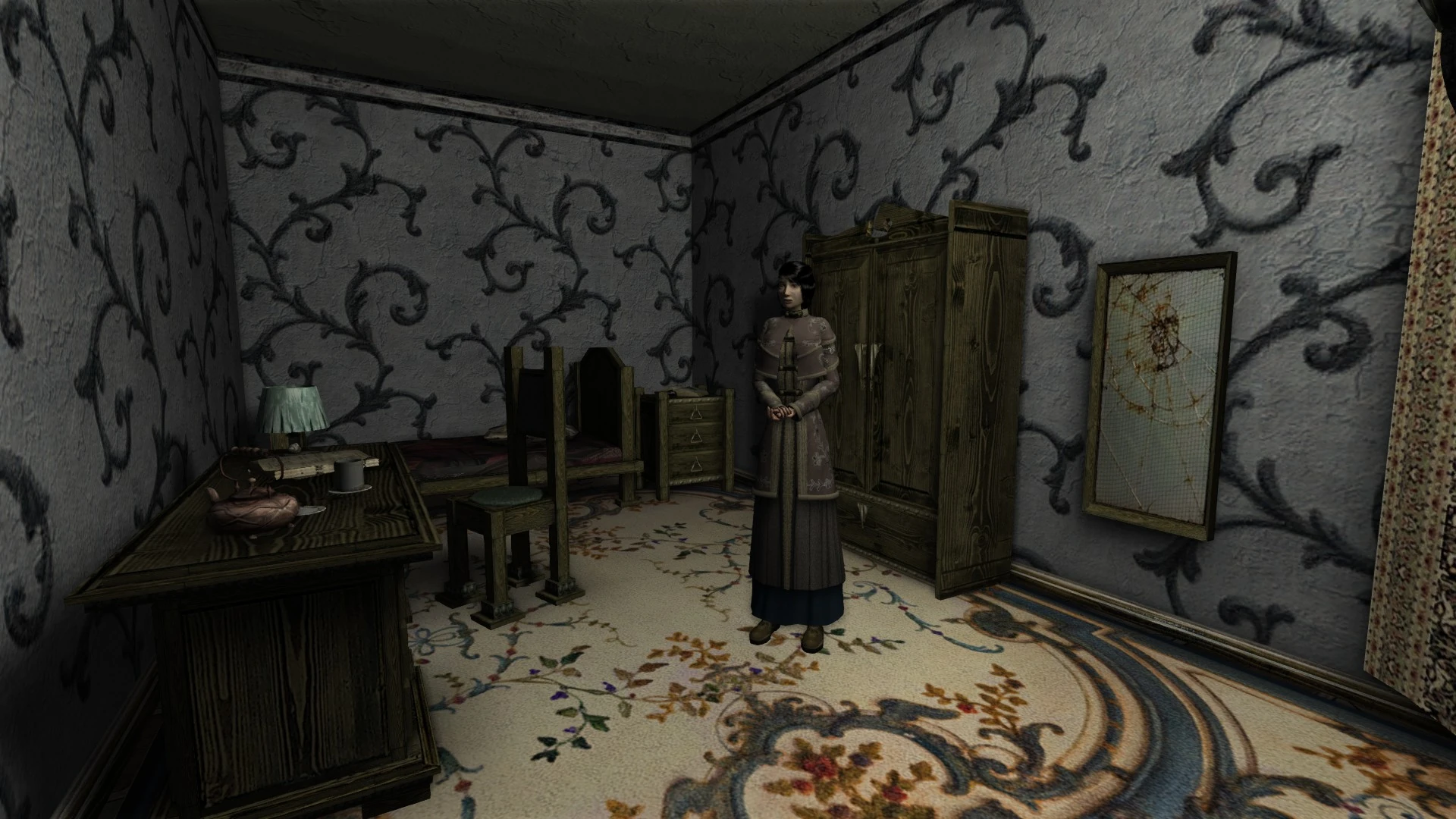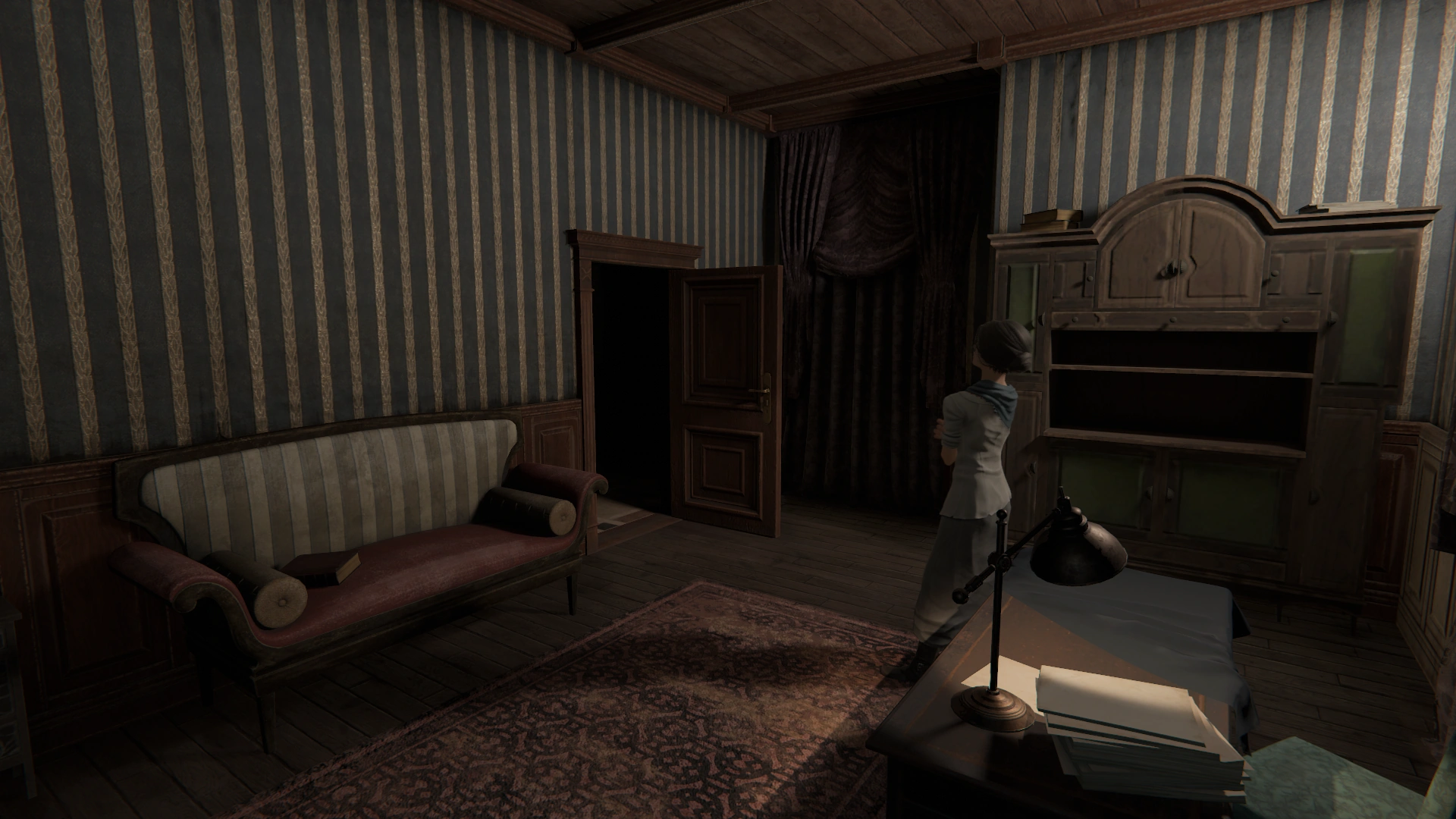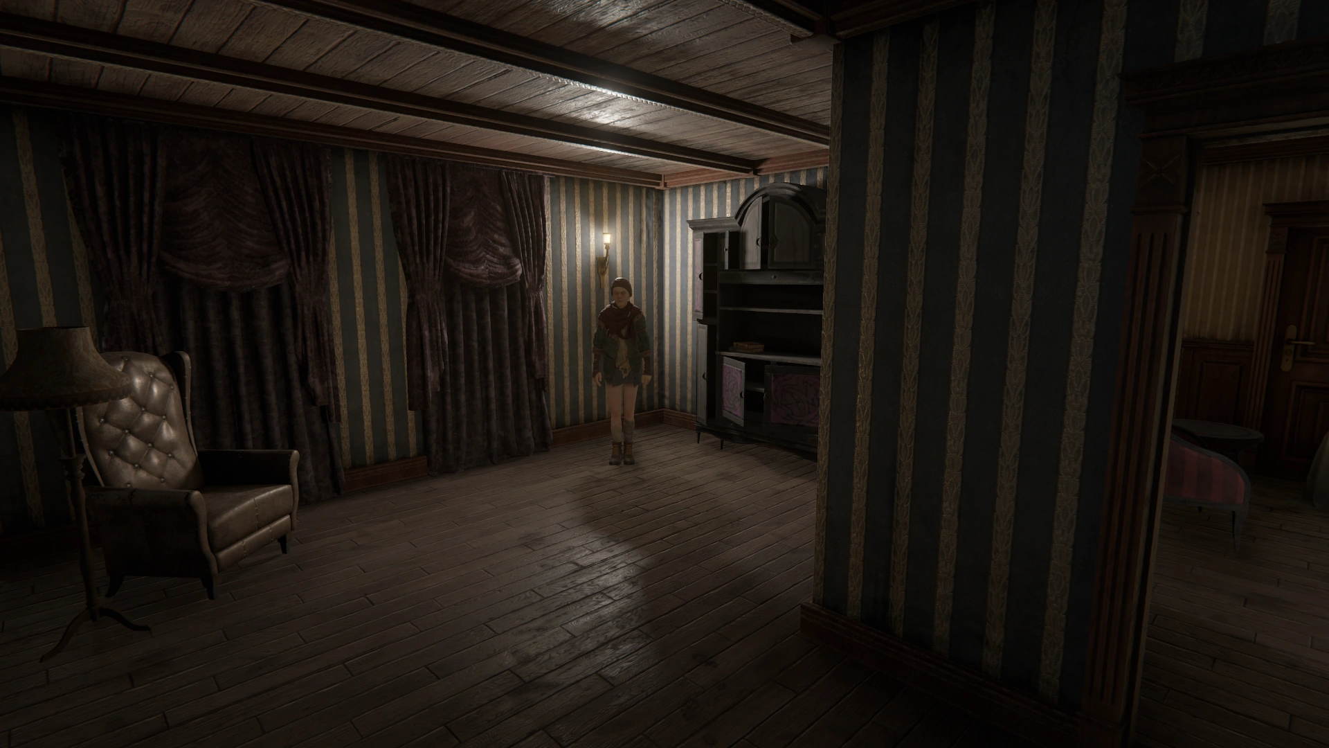 The Shelter contains a number of cabinets, all but one of which can store items indefinitely. It also has a sofa where the Haruspex may sleep, and a clock to save at. In the room opposite from where Lara resides, there is a large cabinet that is not safe for the player's stored items, as it will occasionally be stocked with items from Lara.