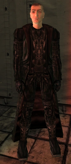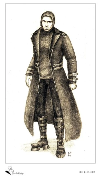 Rubin is an incredibly tall man, with sparse hair on his head and an unshaven stubble on his jaw. He has dark brown eyes and an stern stare. He wears a leather ensemble with a long black coat that reaches his heels, with brown leather lining the inside. His coat is loosely tied across a black leather shirt, with leather pants and laced leather boots. Similarily, he wears black leather gloves. There is a small scar on the top of his head.