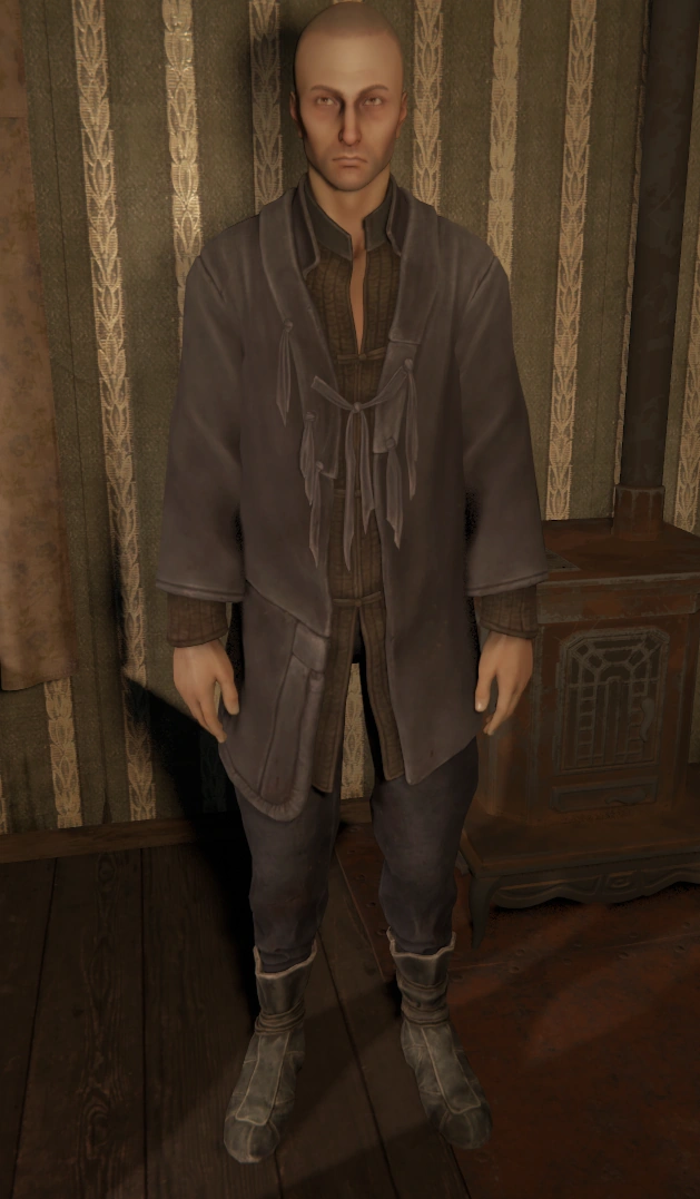 Rubin is a very tall man, with intense hazel eyes and a bald head, which seems to be a new decision of his; Artemy comments that he looks like either a monk or a soldier[1]. He has an unshaven stubble growing on his face. He wears a brown button down shirt beneath a periwinkle blue robe, with several tassels up the chest that tie across. He wears pants in a similar shade to his robe, and makeshift shoes made out of brown cloth tied around his ankles. He is usually seen sitting when in game, but seems to stand with a slouch.